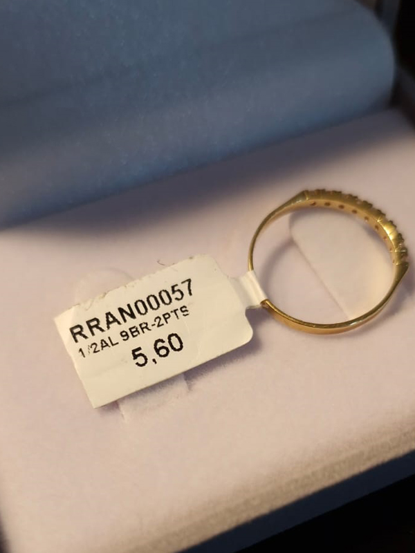Meia aliança ouro amarelo 18K com 9 unidades de brilhantes de 2 pontos cada.